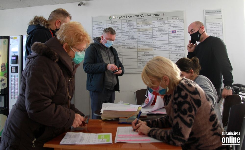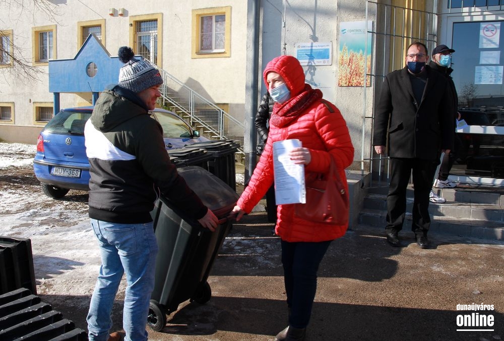 Kint a metsző hidegben még néhány szó szerint összefagyott konténert is látunk, de bent, az Innopark központi épületének földszintjén barátságosabb a klíma, és folyamatos a sürgés-forgás – az első kukák átvevőivel intézi az ilyenkor elmaradhatatlan adminisztrációs tennivalókat az önkormányzat. Átadás-átvétel, első nap.