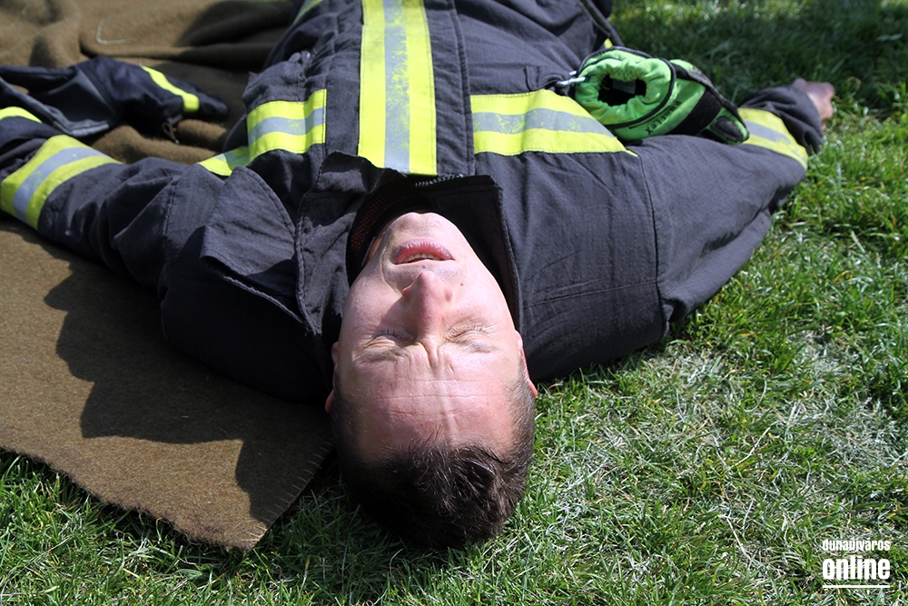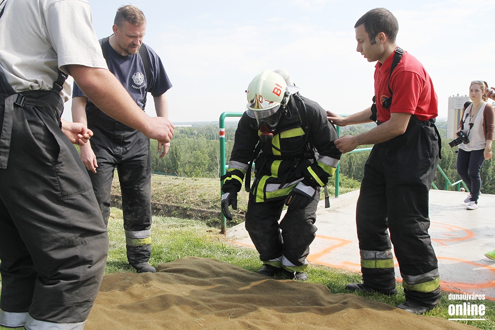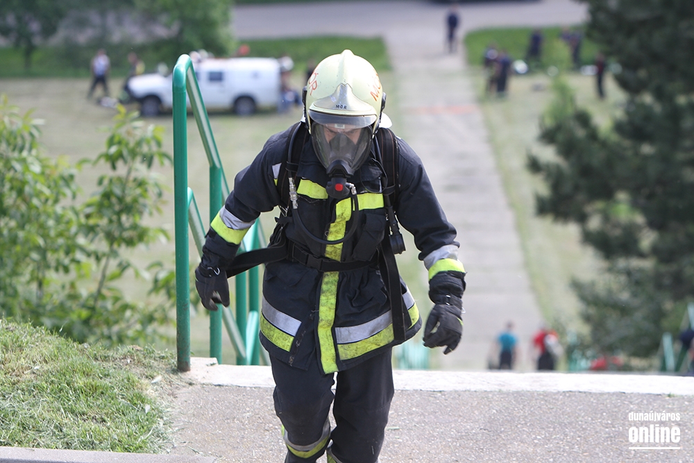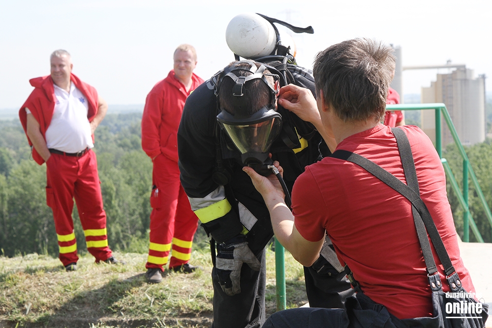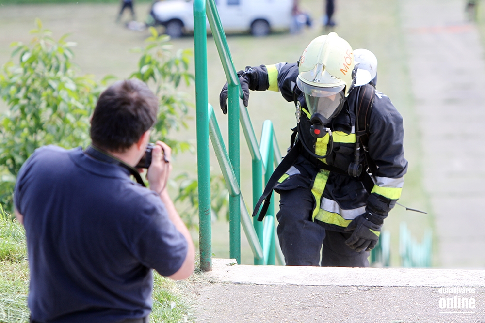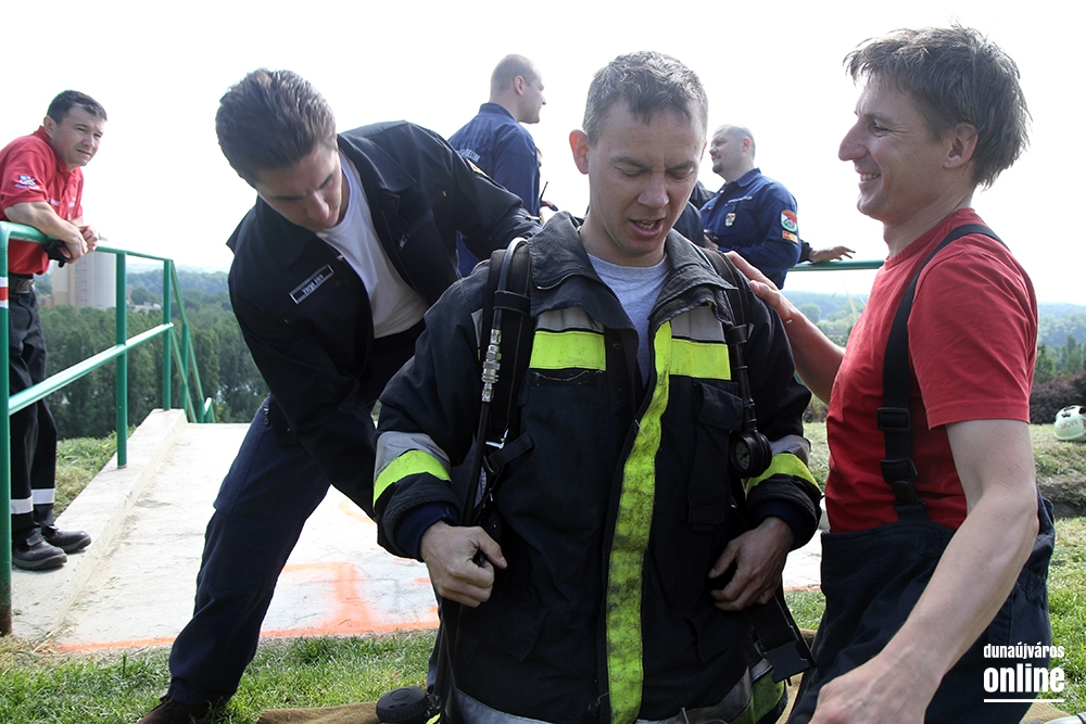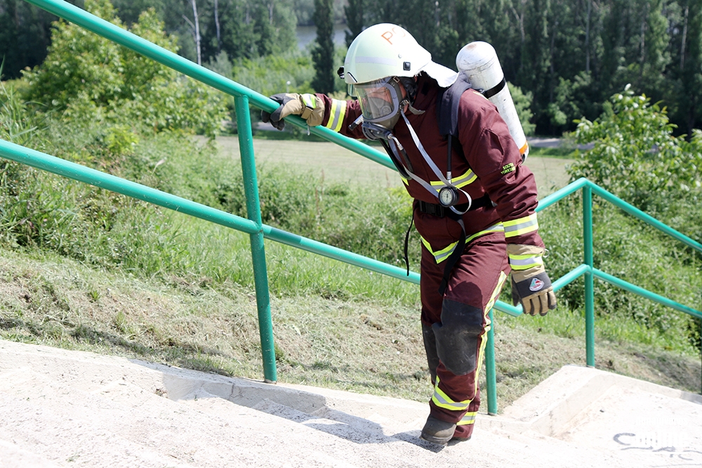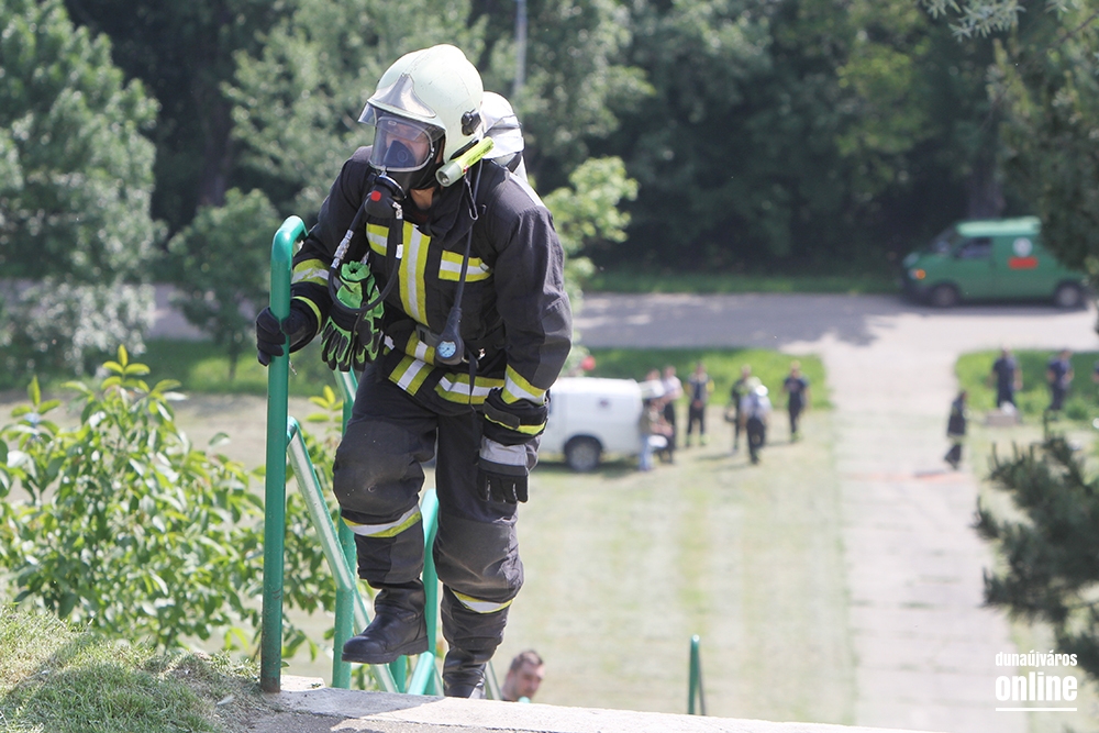 Lépcsőfutó versenyt rendeztek városunkban ma a víztorony alatti Duna-parton teljes védőfelszerelésben, légzőkészülékkel.