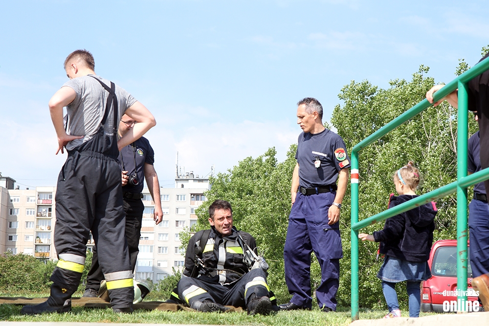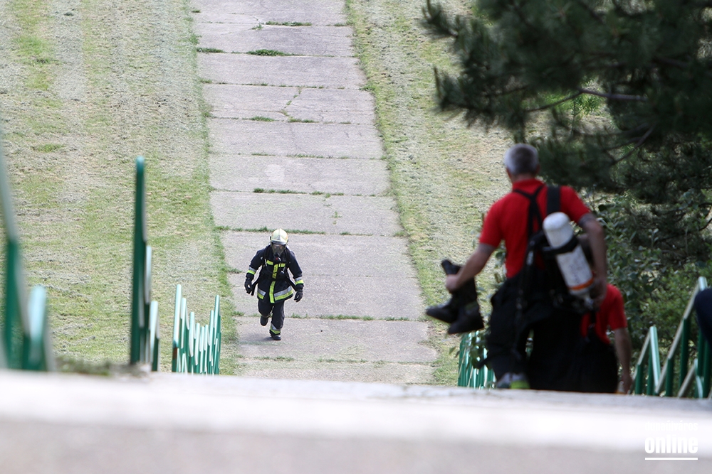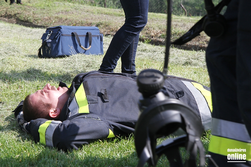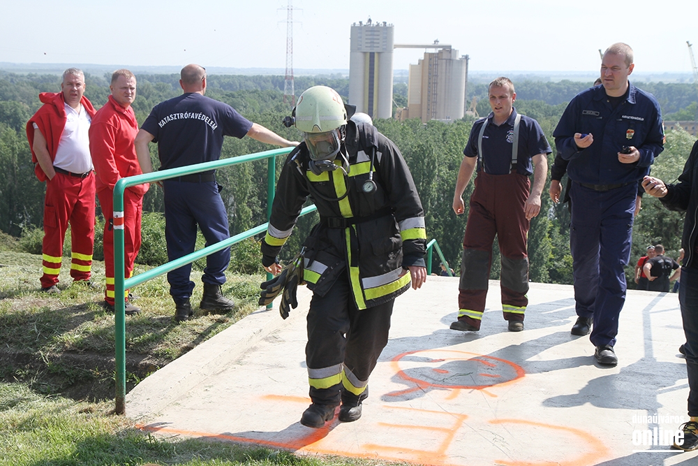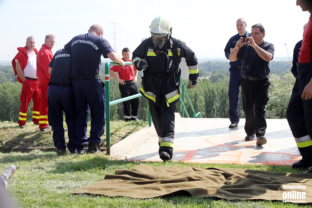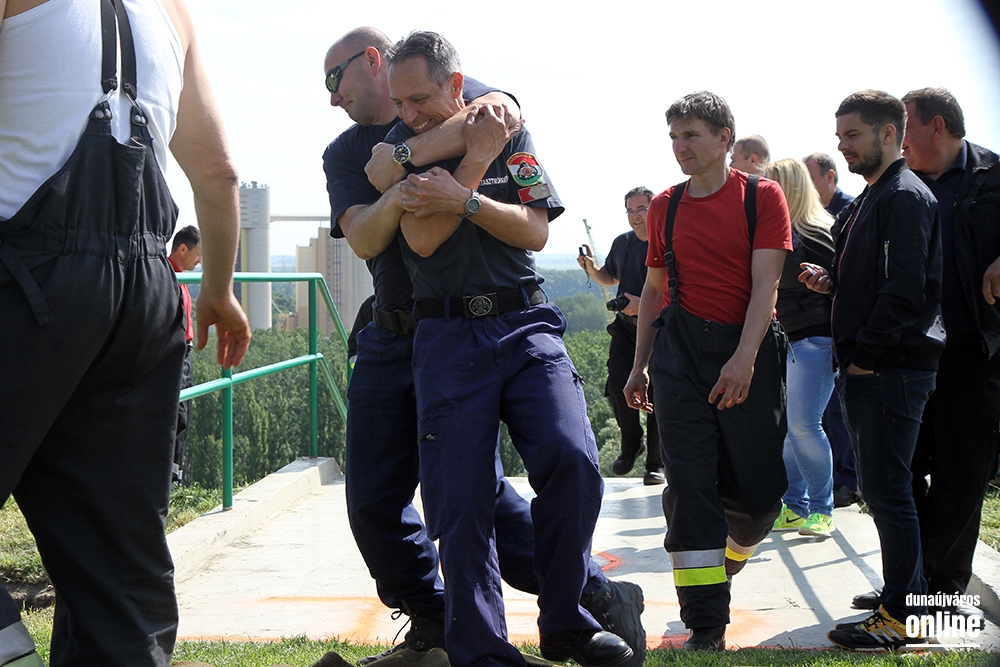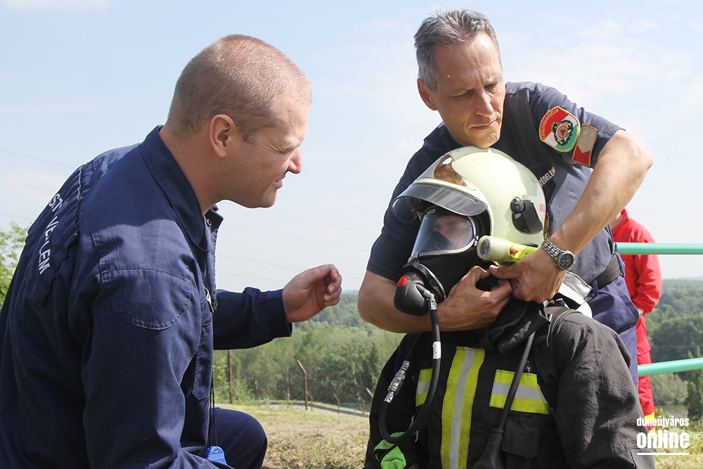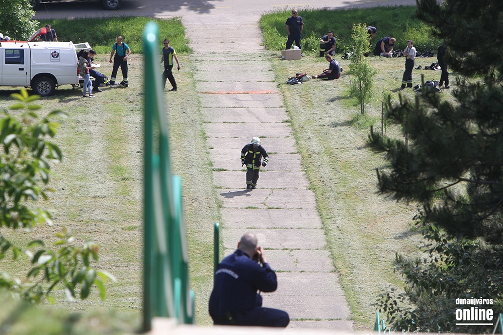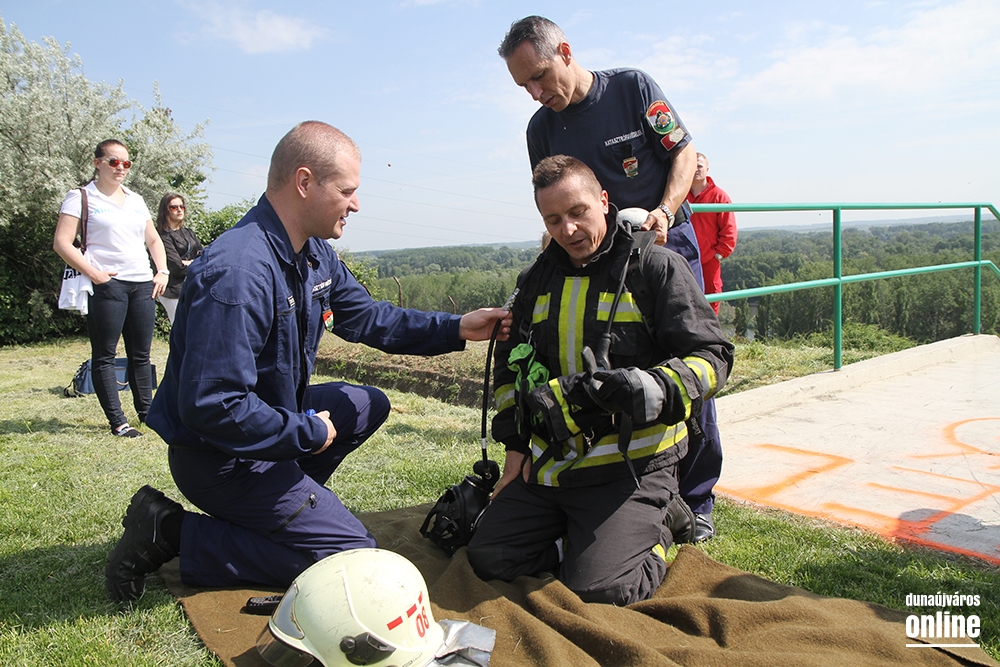 Lépcsőfutó versenyt rendeztek városunkban ma a víztorony alatti Duna-parton teljes védőfelszerelésben, légzőkészülékkel.