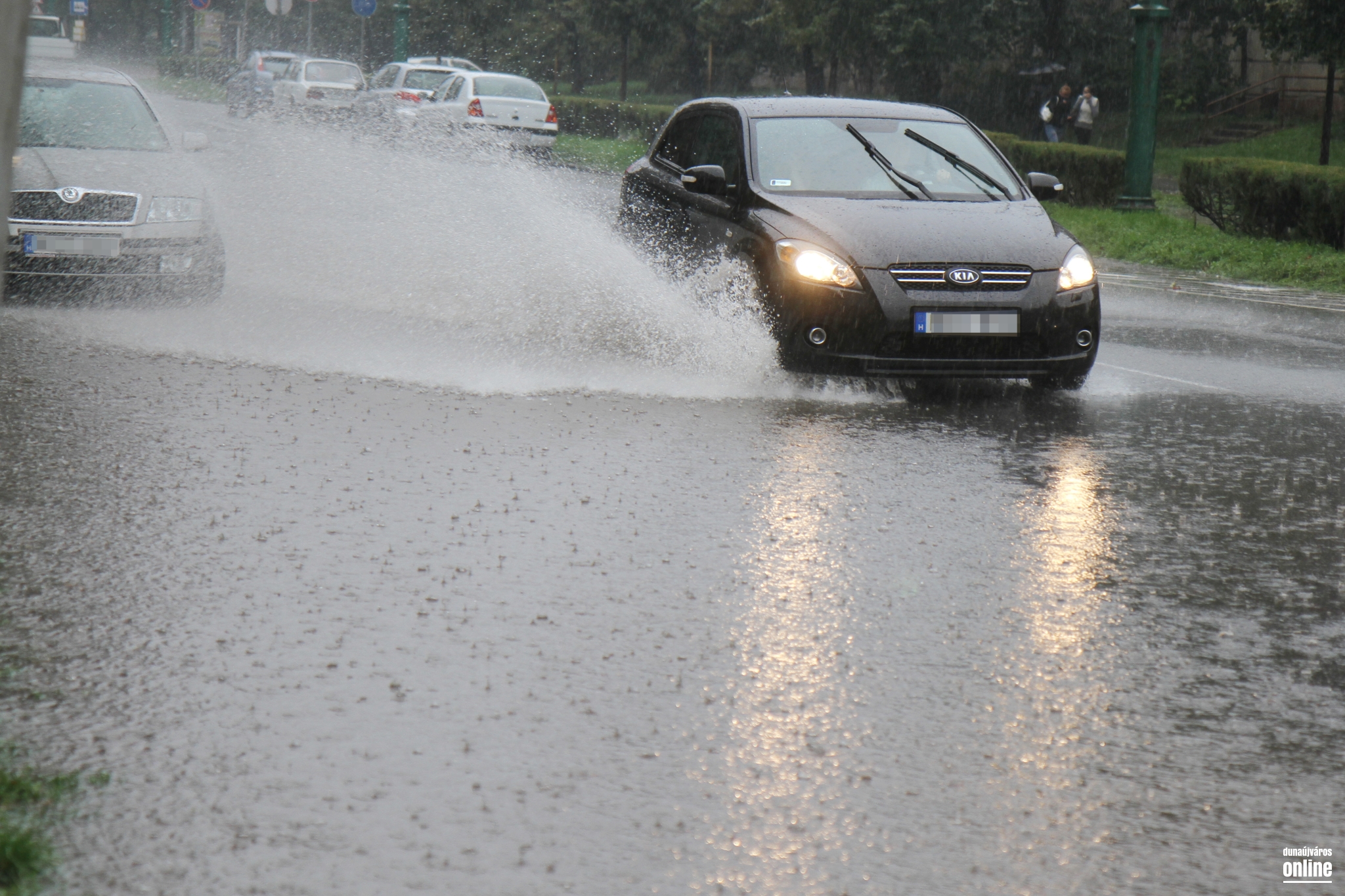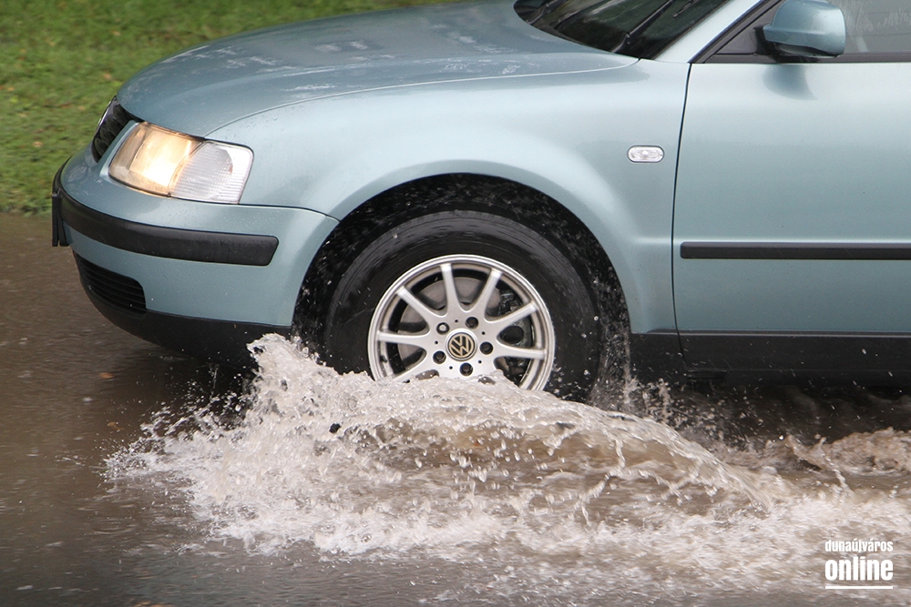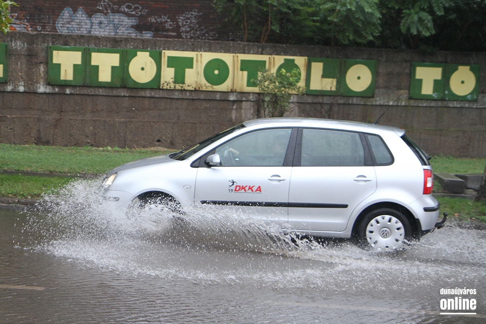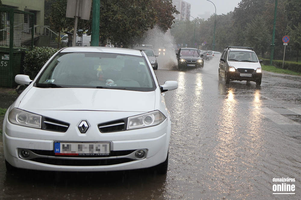 Az Eszperantó út elején is áll a víz, dugóra ugyan nem kell számítani, de a felgyülemlett vízmennyiség itt is akadályozhatja a forgalmat.