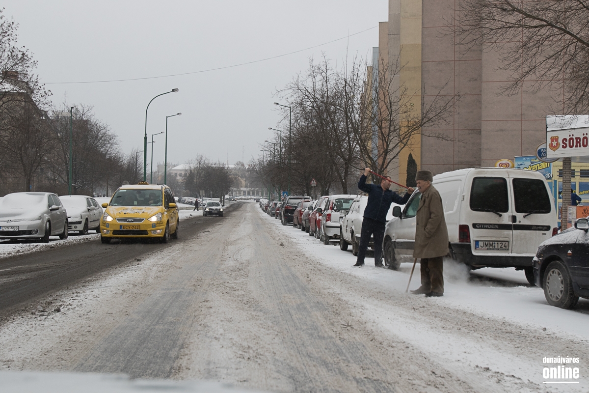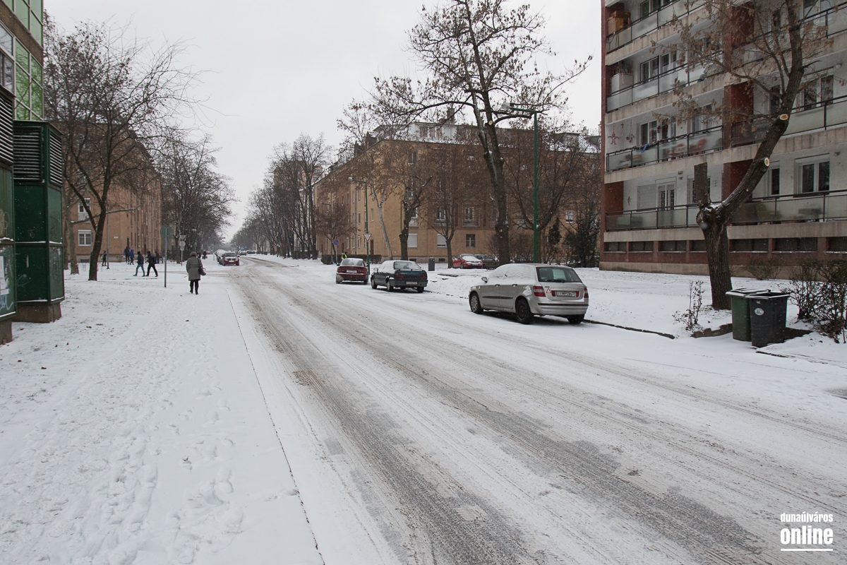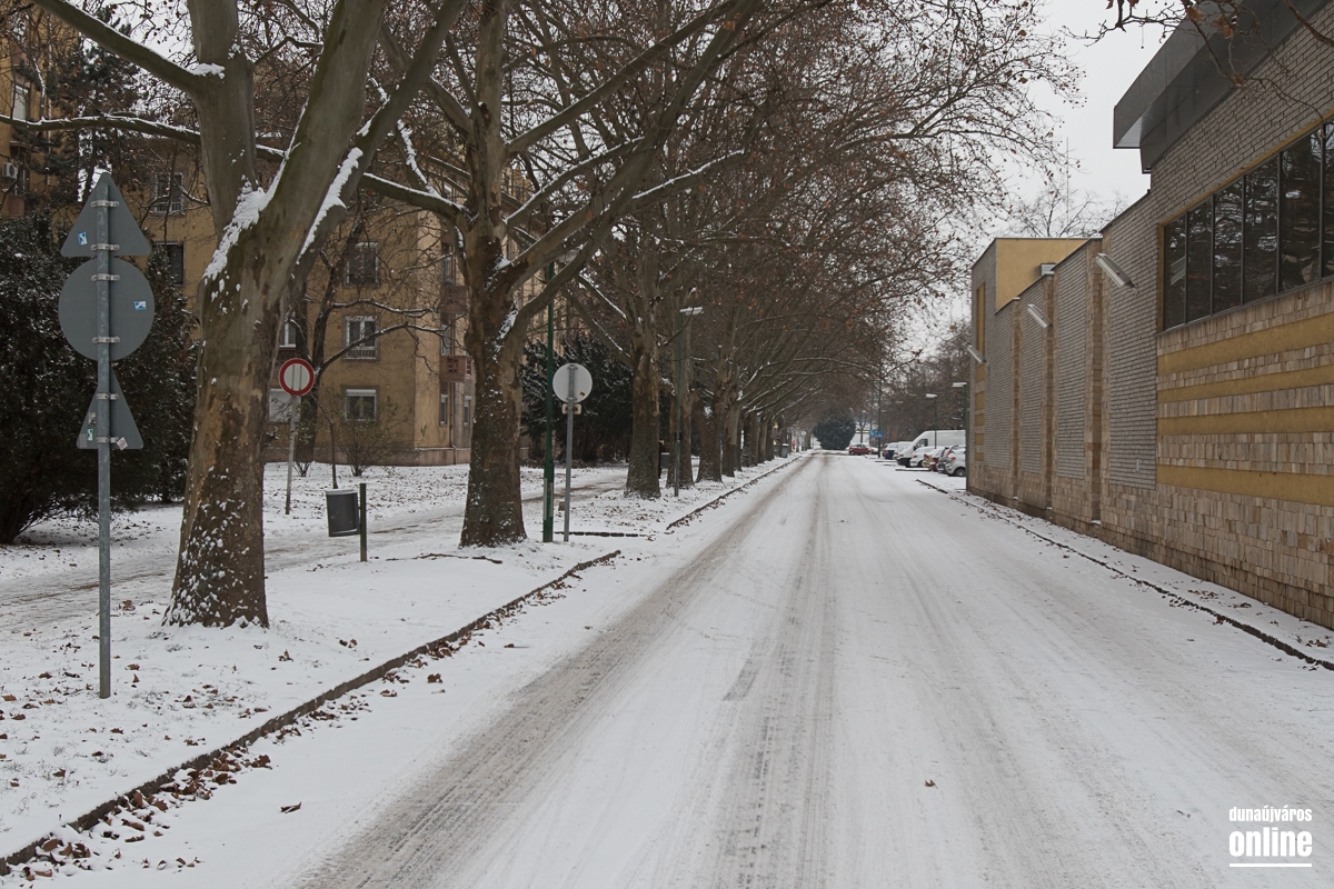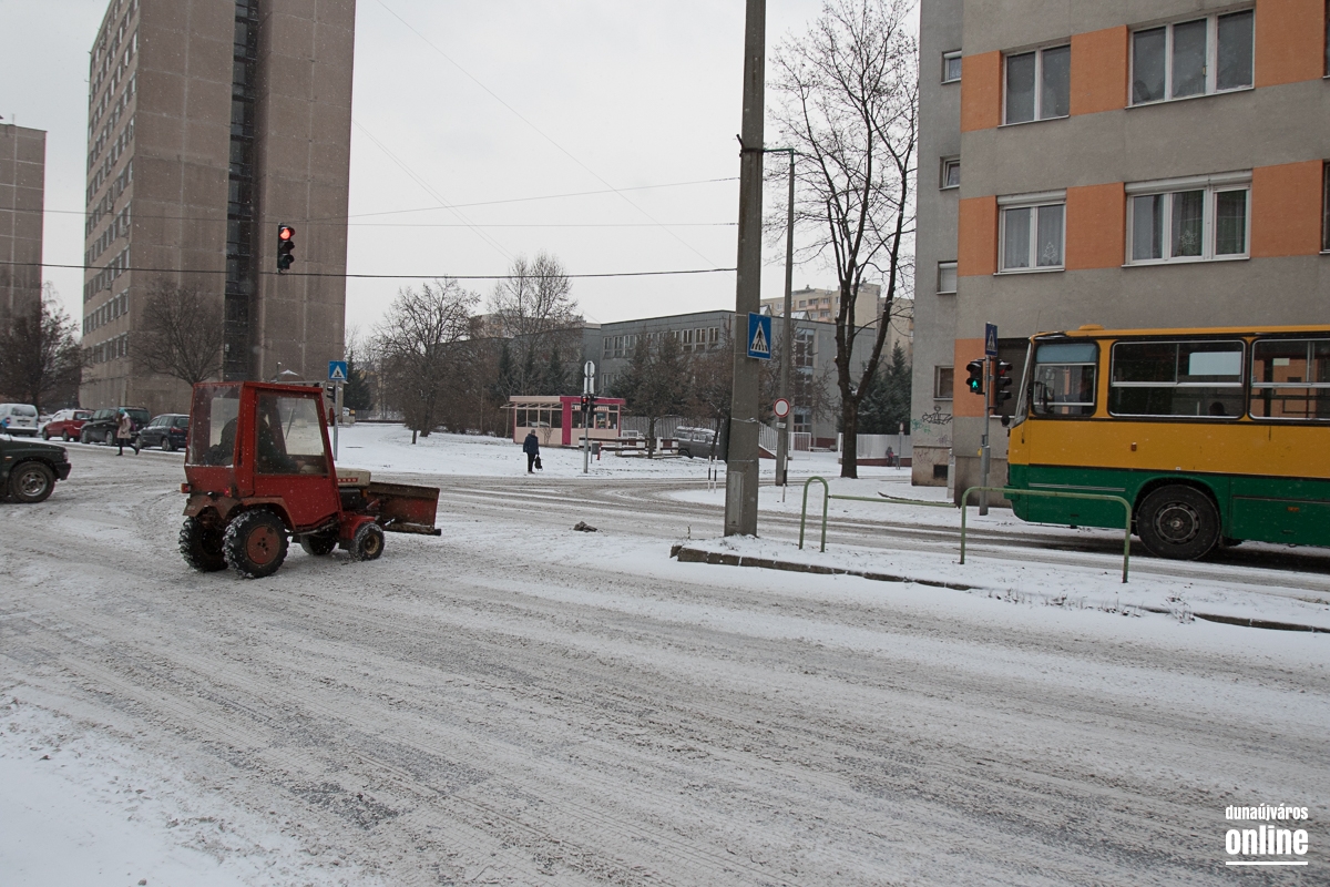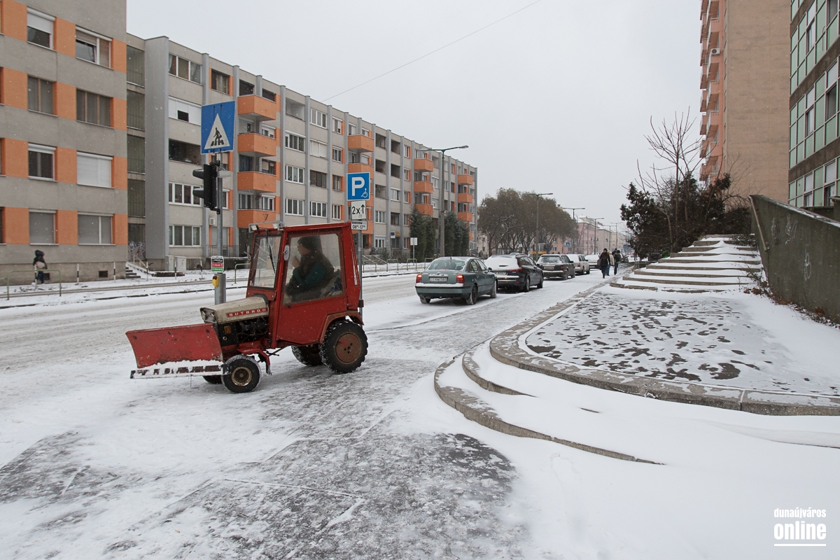 Az Aranyvölgyi úton jöttünk vissza a városba, szintén lassan járható ez az útszakasz, a letaposott hótól a csúszós. A Pincesor gyakorlatilag csak nedves, azon simán lehetett közlekedni. A Rómain és az Új Vasmű úton letaposott havas volt az aszfalt, hókotróval ezeken a szakaszokon sem találkoztunk. Nem úgy a Városháza térnél, ahol a kisebb gépek a járdákat takarították.