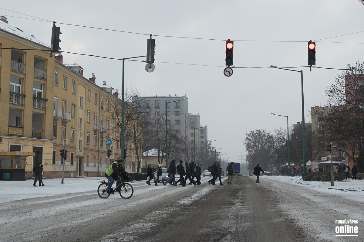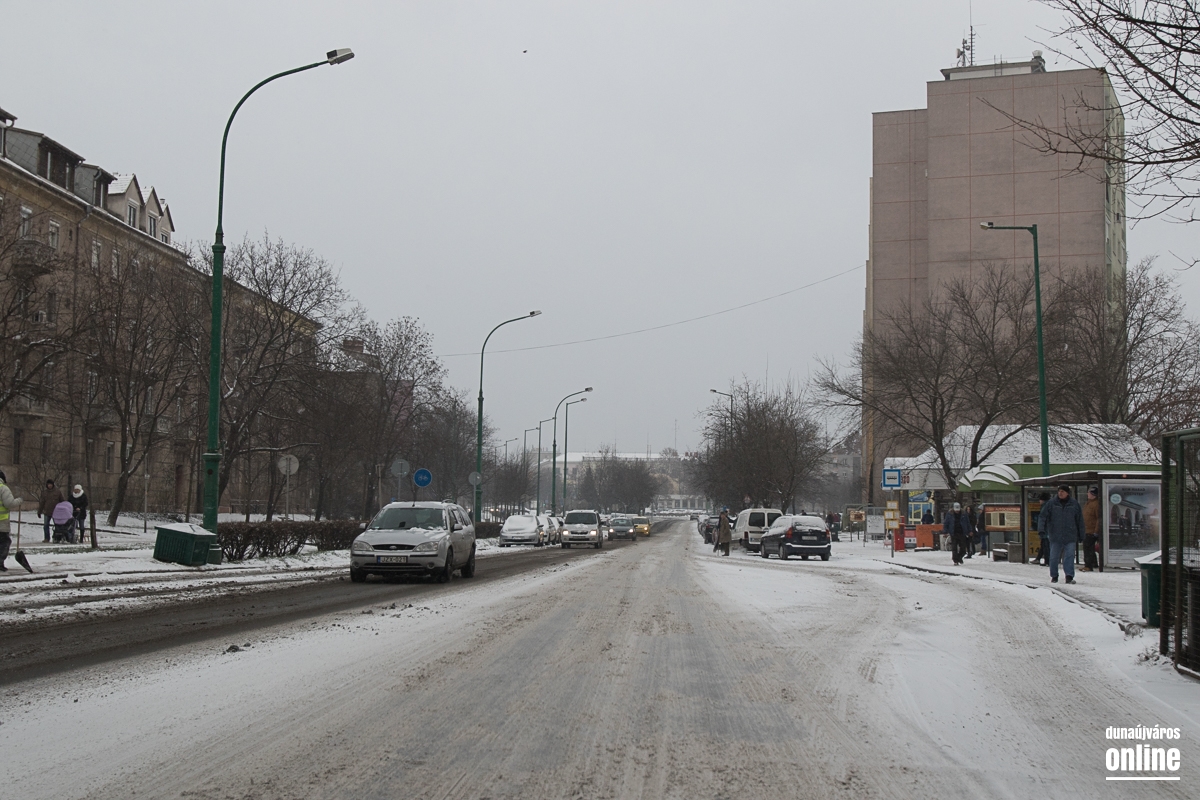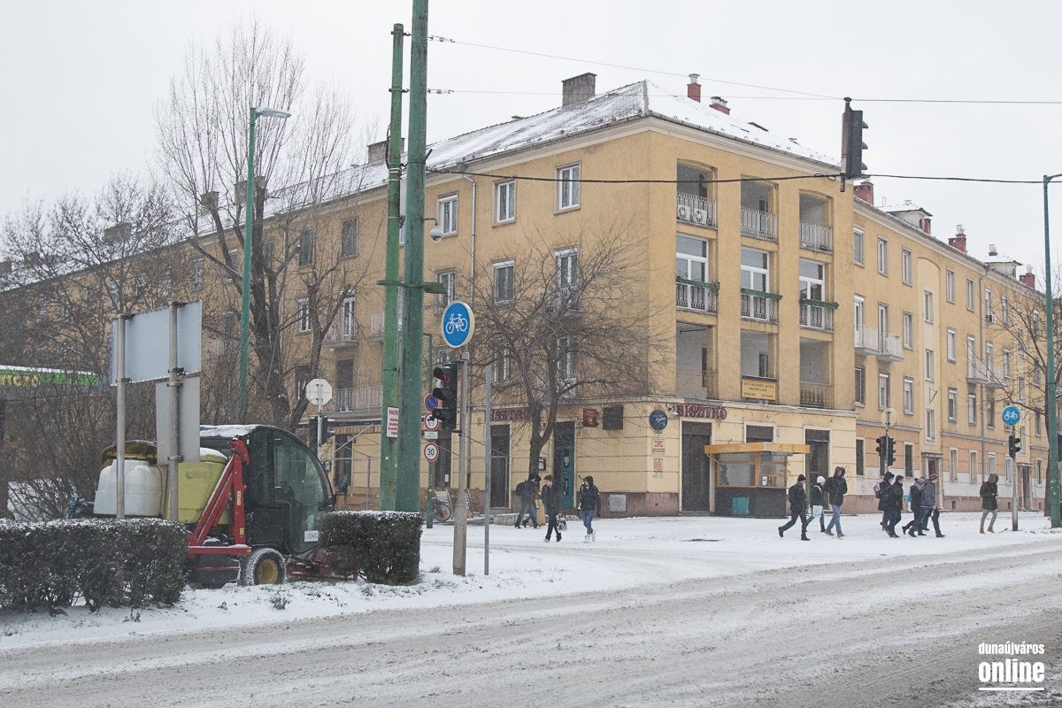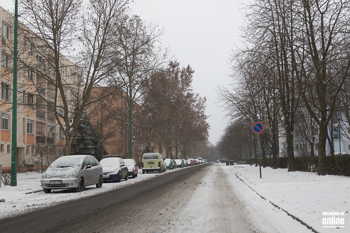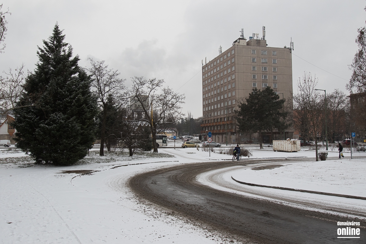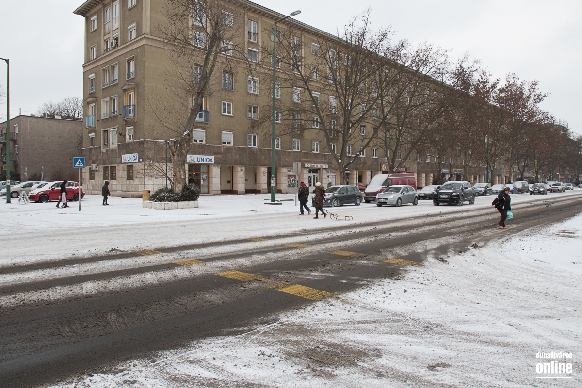 Az Aranyvölgyi úton jöttünk vissza a városba, szintén lassan járható ez az útszakasz, a letaposott hótól a csúszós. A Pincesor gyakorlatilag csak nedves, azon simán lehetett közlekedni. A Rómain és az Új Vasmű úton letaposott havas volt az aszfalt, hókotróval ezeken a szakaszokon sem találkoztunk. Nem úgy a Városháza térnél, ahol a kisebb gépek a járdákat takarították.