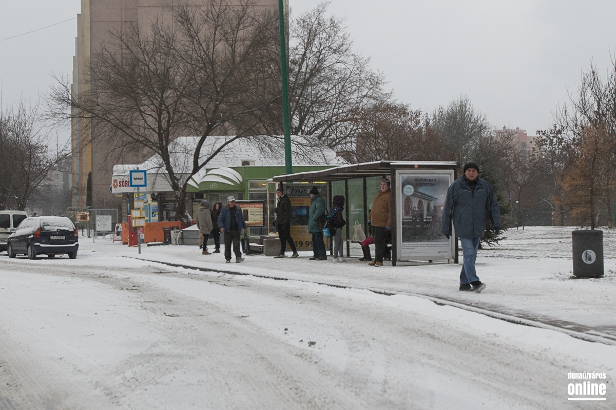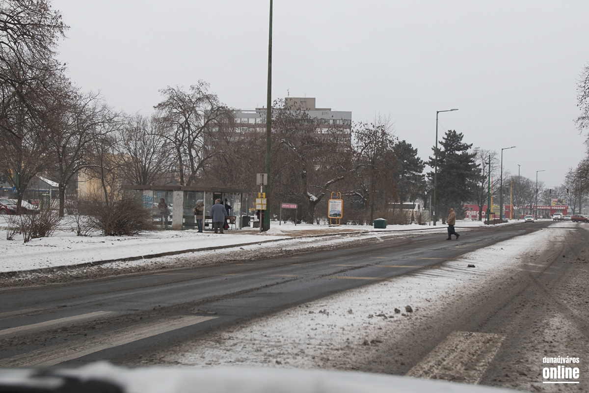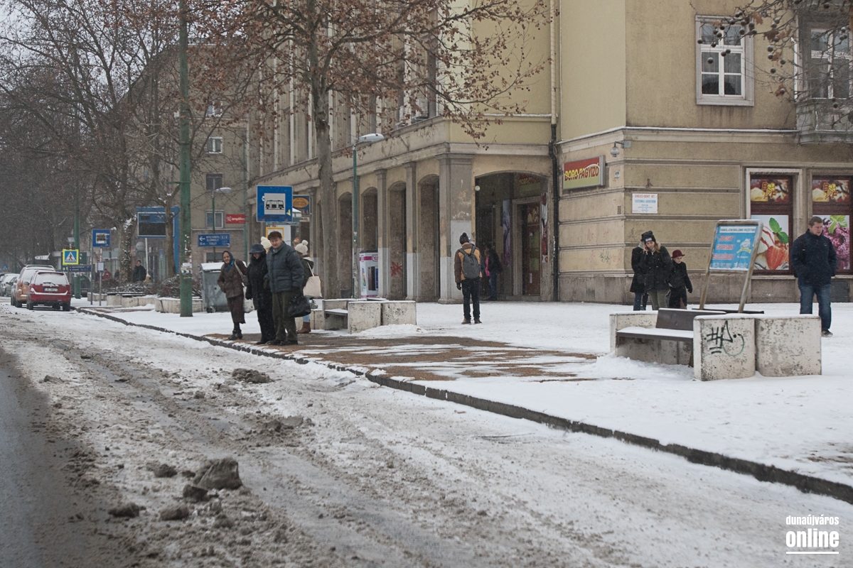 A mozi előtti helyi és távolsági járatok megállóját felszórták. A gyalogosok sajnos - legalábbis akiket mi láttunk - többségében nem törődnek a havas és nehezebben járható utakkal, sokszor nem is a zebrán kelnek át az úton, fékezésre kényszerítve ezzel az autósokat.