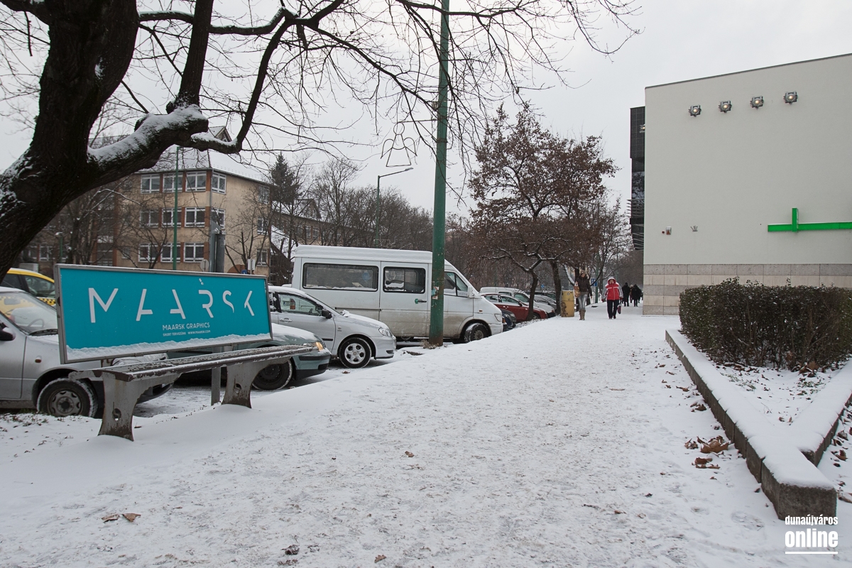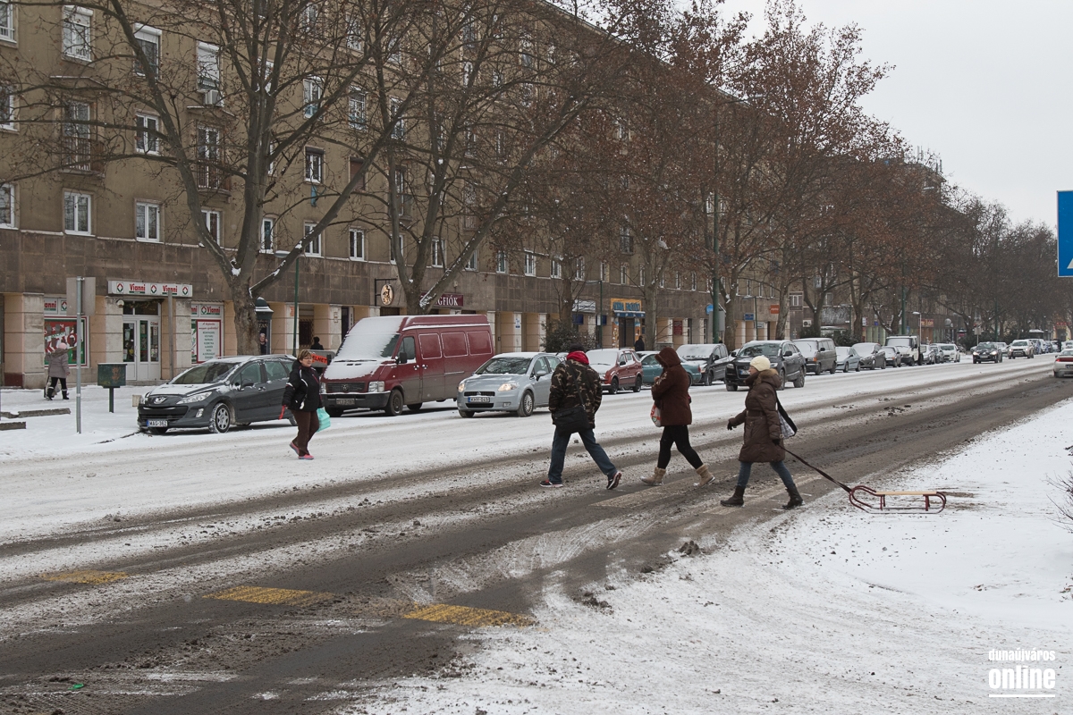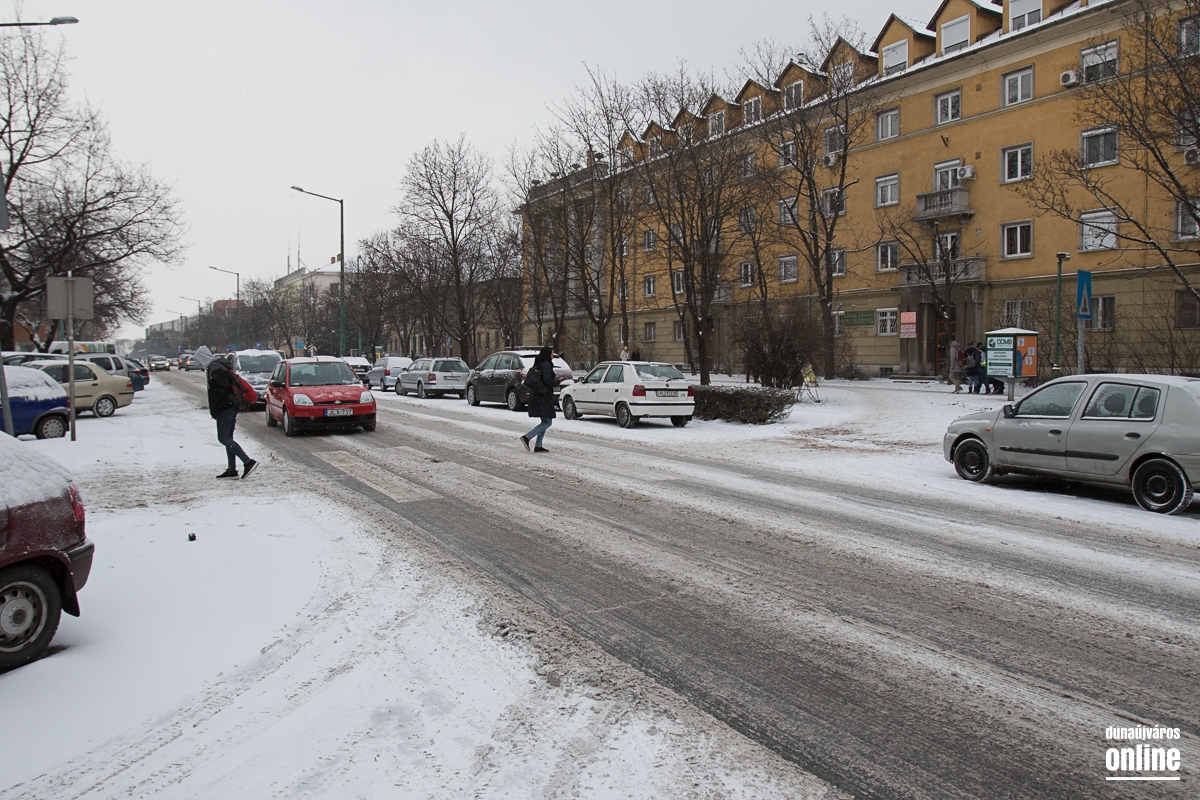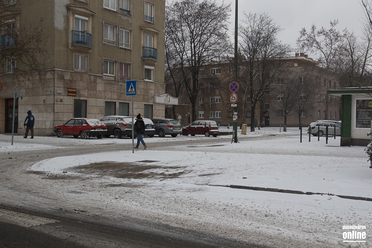 A mozi előtti helyi és távolsági járatok megállóját felszórták. A gyalogosok sajnos - legalábbis akiket mi láttunk - többségében nem törődnek a havas és nehezebben járható utakkal, sokszor nem is a zebrán kelnek át az úton, fékezésre kényszerítve ezzel az autósokat.