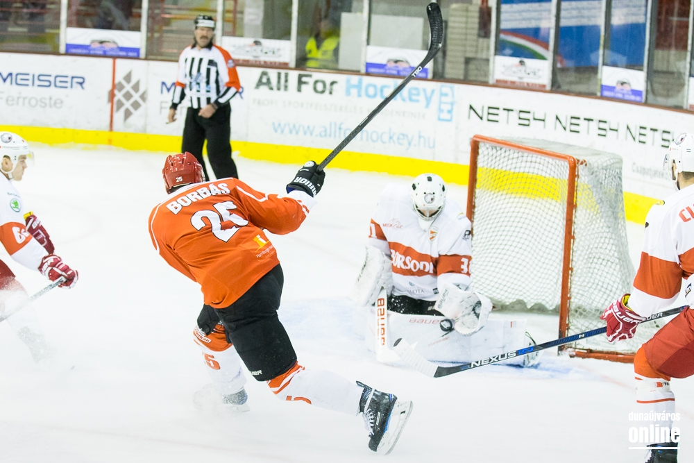 A kezdésre nem is lehetett panasza a hazai drukkereknek, mert a mieink rendkívül elszántan vetették magukat a küzdelembe, s ez a 3. percben már az eredményben is megmutatkozott, mert Becze egy szépségdíjas góllal megszerezte a vezetést a DAB-nak, majd gólörömében kitörte a plexit, így szűk negyed órás műszaki szünet után folytatódhatott csak a meccs (1-0).