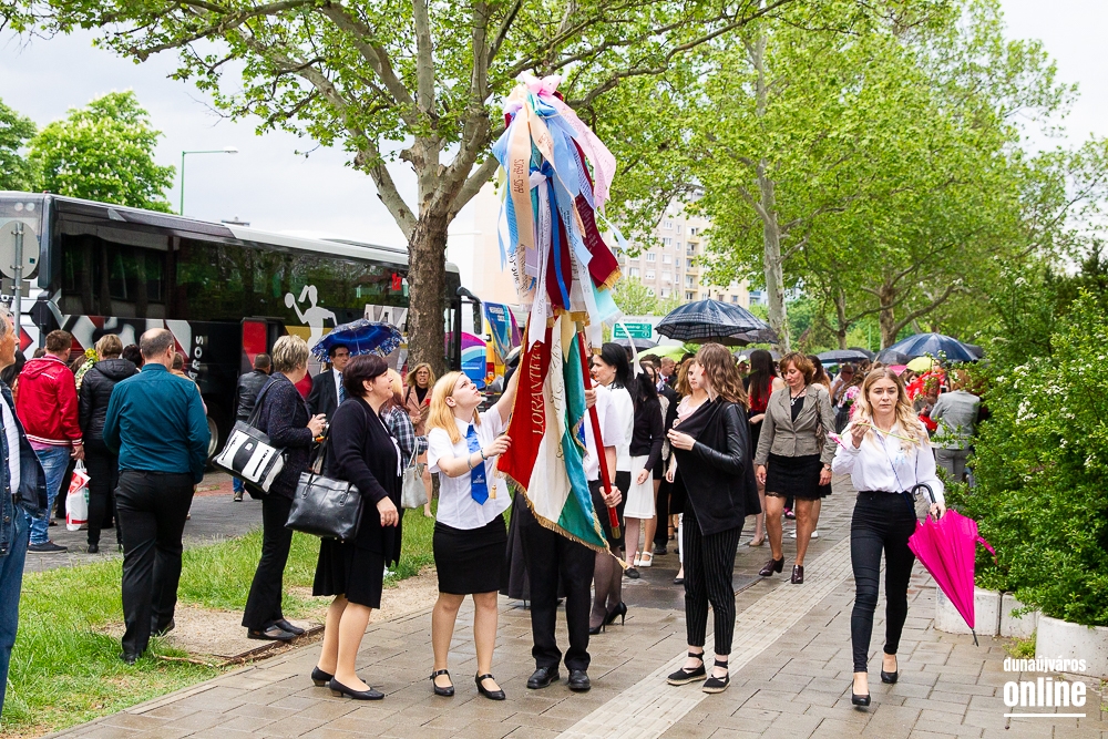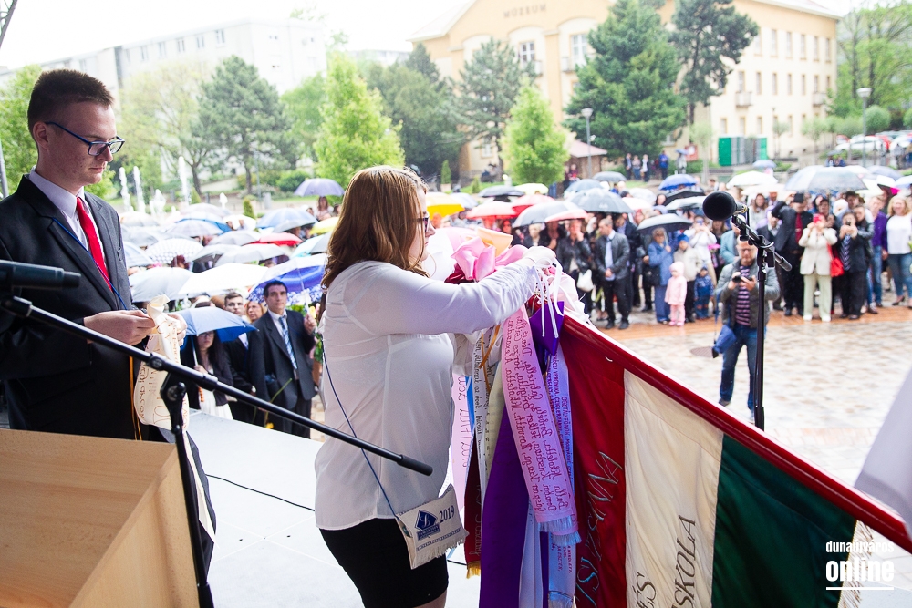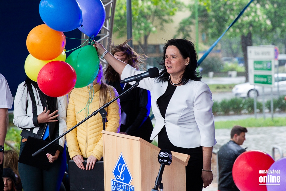 A folytatásban az osztályok szalagjait tűzték fel az iskola zászlajára, majd a zord időjárási körülmények miatt Pocsainé Varga Veronika, a Lorántffy iskola intézményvezetője csak rövid köszöntőt mondott. Mint mondta az iskola életében rendhagyó ez a nap, mert nem a suli falai között tartják meg a ballagást, hanem a város előtt, a főtéren, de mint mondta erre büszke, mert így megmutathatják Dunaújvárosnak, hogy milyen iskola is a Lorántffy és milyen sikeres és nagyszerű diákok is járnak a falai közé. A ballagást egyfajta búcsúként aposztrofálta, melyre, mint mondta a diákok egész életükben emlékezni fognak és ehhez semmi köze a hirtelen leszakadt esőnek, ami kicsit megcifrázta a ceremóniát. Megköszönte a szülők bizalmát, hogy ezt az iskolát választották gyermekeiknek és megköszönte pedagógus kollégáinak azt az odaadó és áldozatos munkát, melyet ezeknek a gyerekeknek a nevelésére fordítottak. A ballagási ünnep zárásaként átadták a kiemelkedő tanulmányi és közösségi munkát végző tanulóknak a jutalmakat, majd következett a kiosztott lufik égbe engedése.