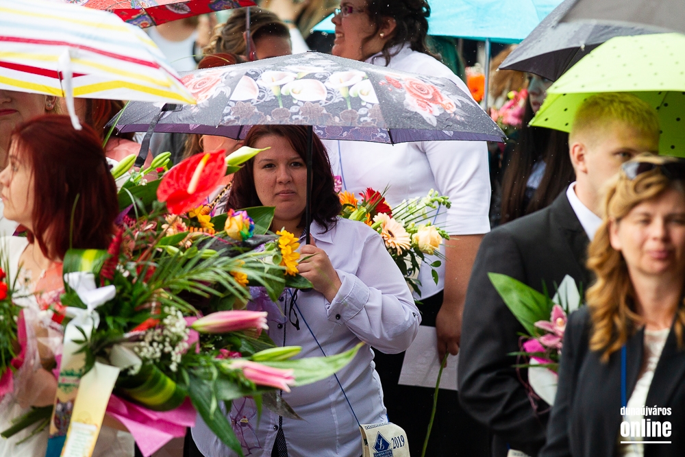 Negyed órával a ceremónia előtt elkezdett szakadni az eső, mely kisebb megszakításokkal ugyan, de kitartónak bizonyult. Ez némileg átírta a ballagási ünnepség koreográfiáját, a szervezők lerövidítették a műsort. Az ünnepség a Himnusz éneklésével kezdődött a diákokkal, szülőkkel hozzátartozókkal és pedagógusokkal megtelt téren. Az ünneplőket elsőként Papp Gréta köszöntötte a ballagó diákok nevében. Beszédében felelevenítette a tanulmányaik ideje alatti legemlékezetesebb eseményeket a gólyatábortól egészen a szalagavatóig. Köszönetet mondott a tanároknak és a szülőknek, hogy kitartottak mellettük végül diáktársait biztatta, hogy mind az érettségin, mind a nagybetűs életben állják meg a helyüket. A köszöntő után Cserna Gábor polgármester állt a mikrofon mögé és mondott ünnepi beszédet.