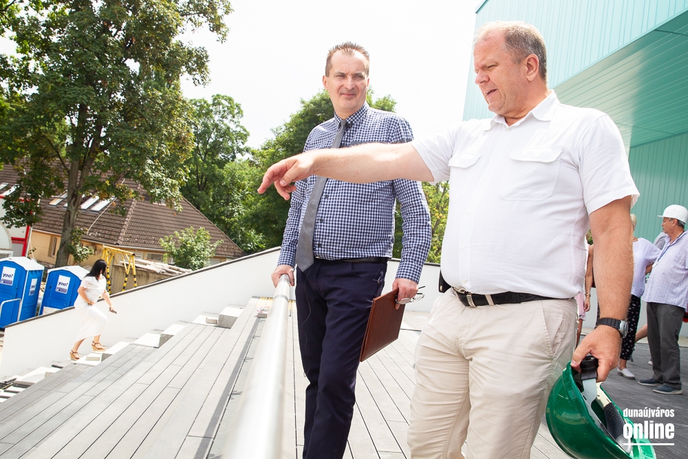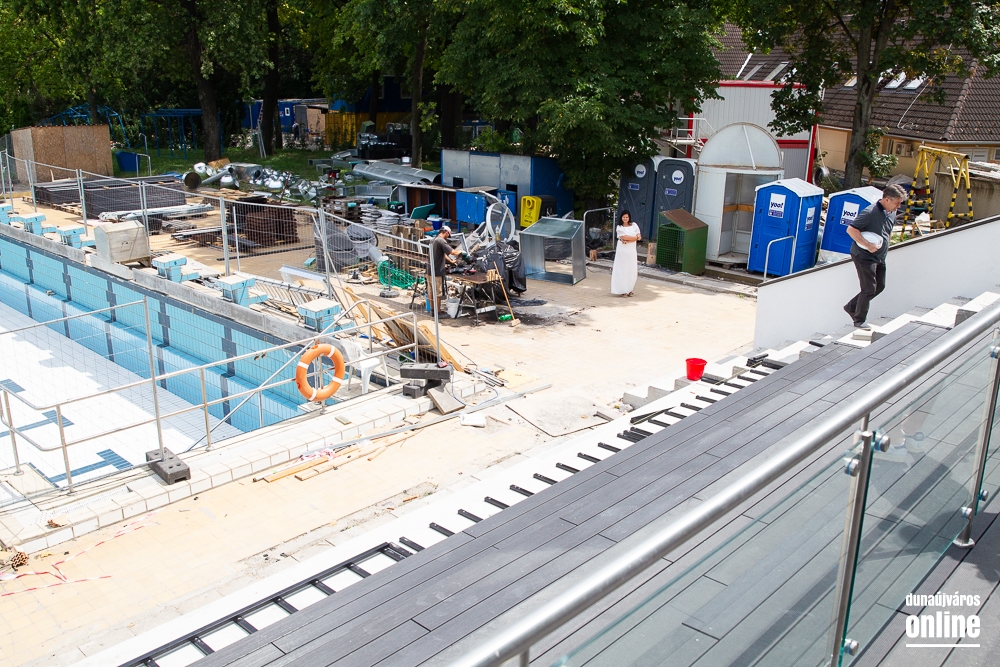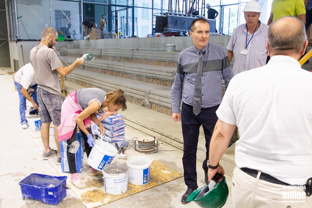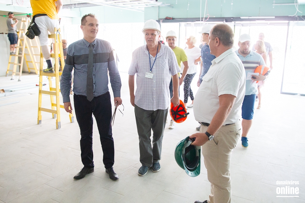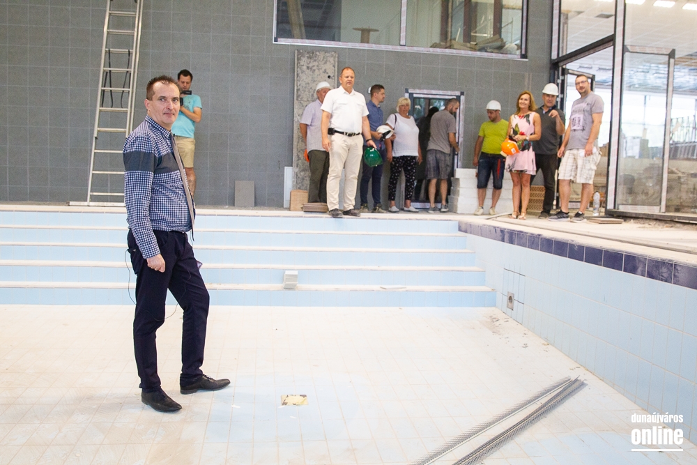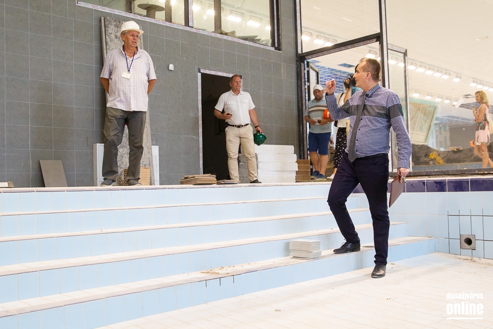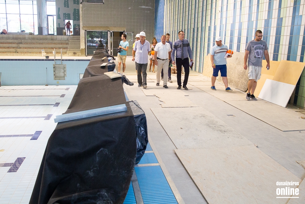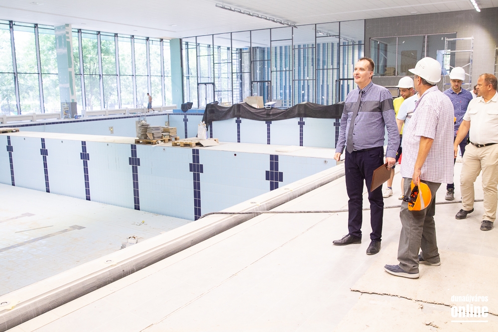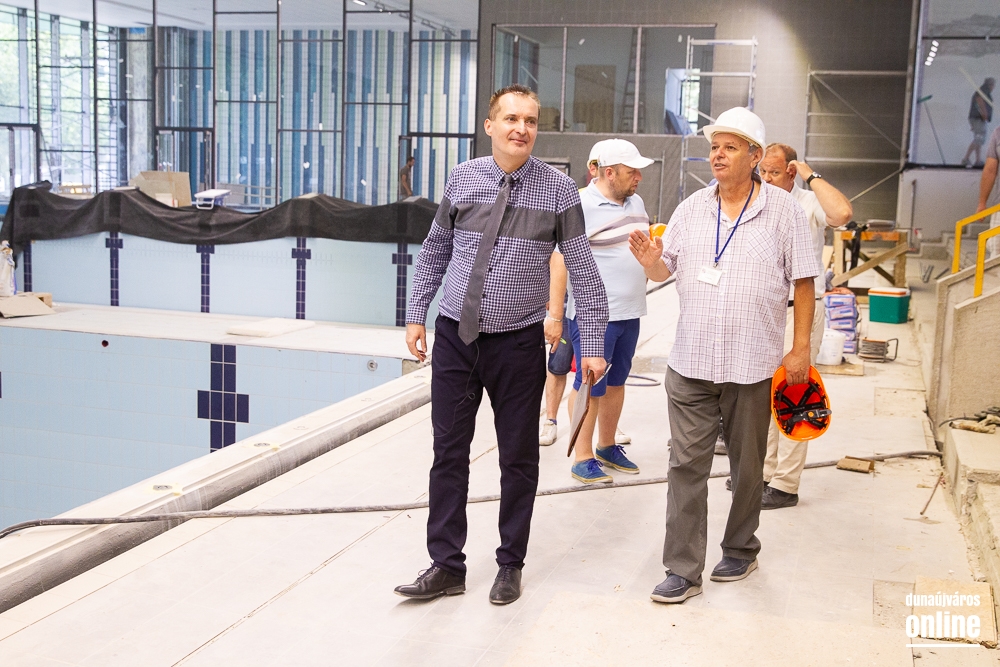 Legutoljára március végén látogatott el Cserna Gábor, városunk polgármestere a Fabó Éva Sportuszodába. Ekkor még a munkálatok felénél tartottak, de jól haladt a fejlesztés. A projekt végéhez közeledve éppen ezért újabb sajtóbejárást tartott Borbély Józseffel, a kivitelező konzorcium projektvezetőjével. A találkozó elején elmondták, az időközben felmerülő pótmunkákra, mint a belső tribün teljes felújítása, vagy a gazdasági lépcsőház megújítása, további 31 millió forintot biztosított az önkormányzat, így zavartalanul folytatódhat a fejlesztés és tarthatják a korábban kitűzött időpontokat. Borbély József elmondta, augusztus 15-én már mindennel kész lesznek, és megkezdődhet a próbaidőszak, amikor a fűtéstől kezdve a vízforgatáson át a hidraulikáig mindent átnéznek és működés közben is tesztelik a berendezéseket az esetleges hibák elkerülése érdekében.
