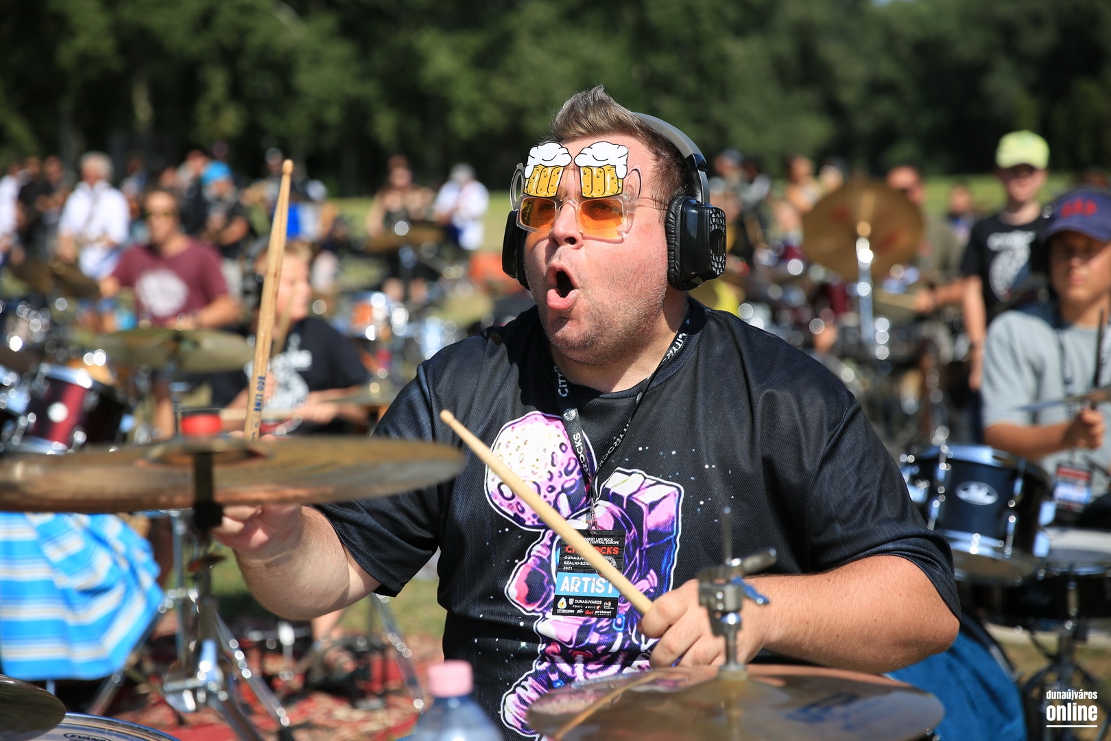 Nagyszerű amatőrök és vidám profik, egy bandában, együtt tolják, végig remek hangulatot varázsolva a placcra – fergeteges élményt szerezve maguknak és a közönségüknek. Sintér Doktor zászlólengetéses-dobolásos irányítására egymás mellett tolja a Skóciából nyárra hazaverődött indián fejdíszes csákó és a börtönparancsnok, a dobok mögött éppen úgy ülhet egy vad futamokat precízen püfölő bróker, mint egy kisdiák. És ütik.