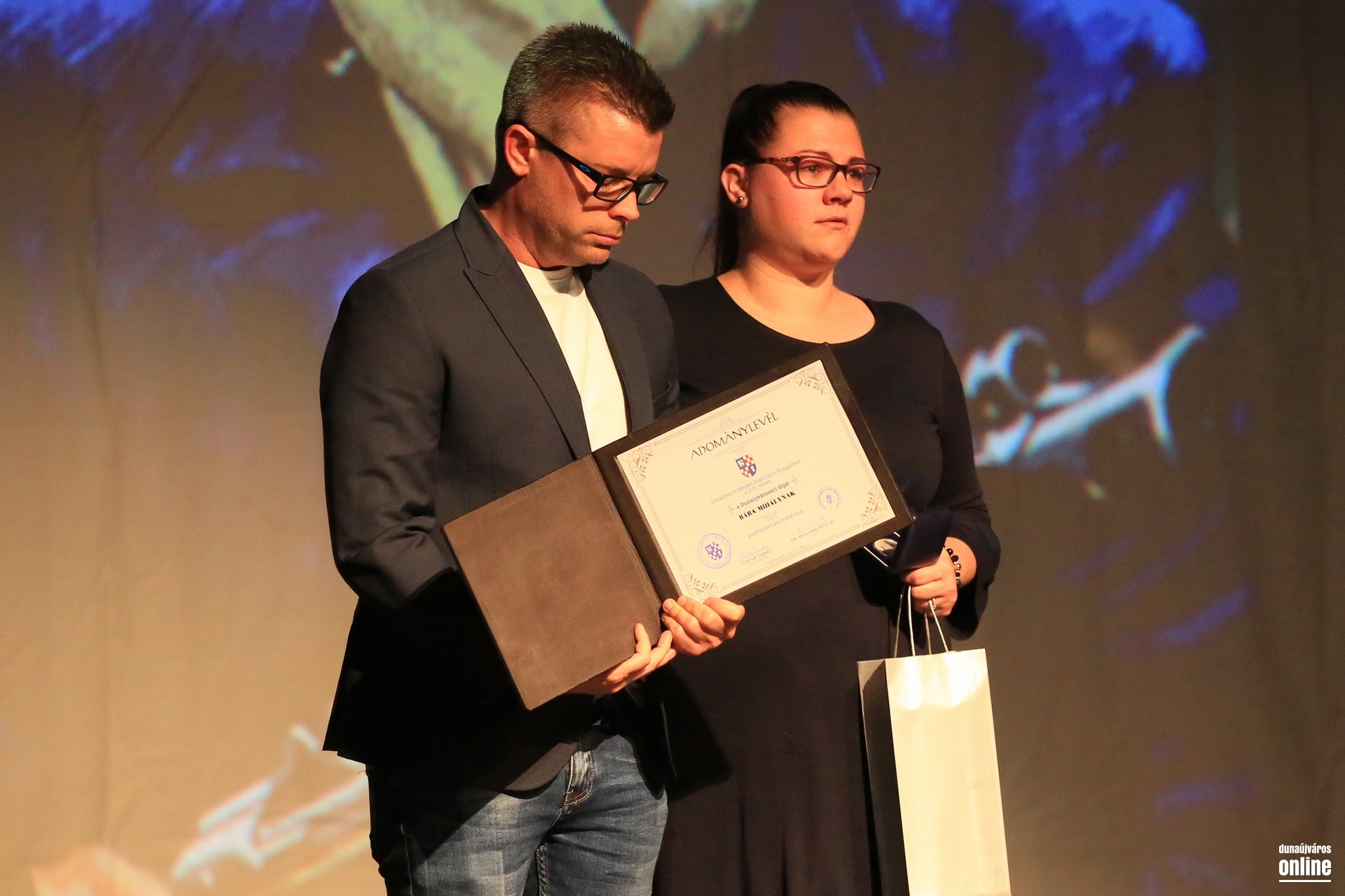 A polgármester szavai után Márai Sándor legendás verse, a Mennyből az angyal című költemény csendült föl, majd a Dunaújvárosért Díjak átadása következett: az önkormányzat rangos elismerését posztumusz Bába Mihály, a női kézilabdacsapat tragikus hirtelenséggel elhunyt masszőre, valamint dr. Baráth Károly szülész-nőgyógyász főorvos kapta – a díjakhoz rendelt méltatásokat összeállításunk végén találják. Az átadási ceremóniát a Vasas összeállításai színezték, az est fénypontja azonban egy meglepetés produkció volt.