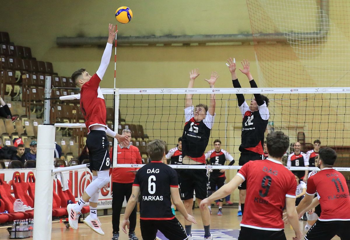 A dágiak ennek megfelelően is kezdtek, hamar megléptek 7-3-ra a nyitó szettben, ám a dunaújvárosi fiatalok becsülettel küzdöttek, 11-nél utolérték ellenfelüket, majd a vezetést is át tudták venni vendéglátójuktól (13-16). Sokáig sajnos nem örülhettek ennek röplabdázóink, mert a hazaiak fordítottak, s bár 20-20-nál még egált mutatott az eredményjelző, a hajrát a Dág bírta jobban (25-21).
