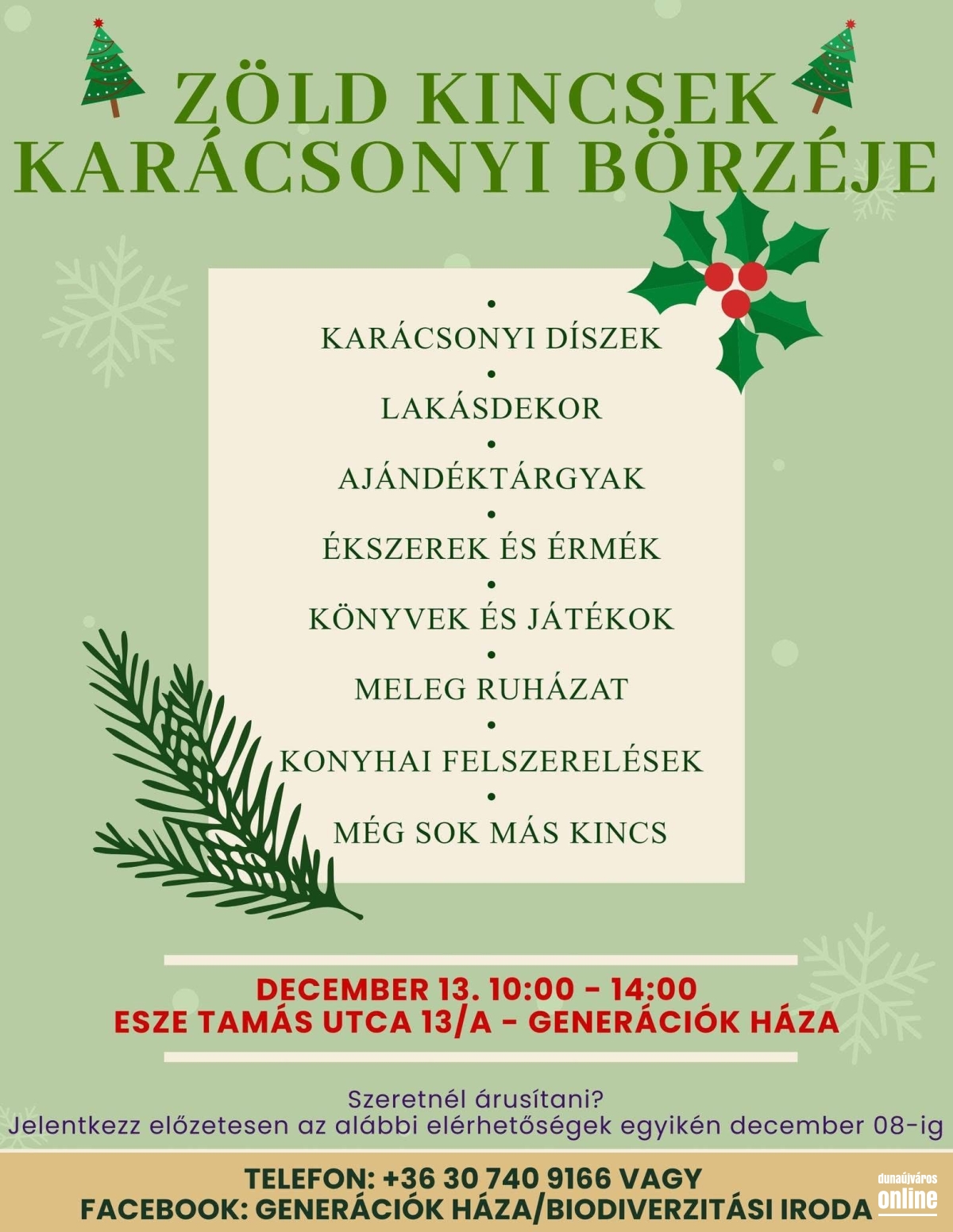Az Esze Tamás utcában található Generációk Házában rendezik meg a Zöld Kincsek Karácsonyi Börzéjét december 13-án délelőtt tíz és délután kettő óra között.