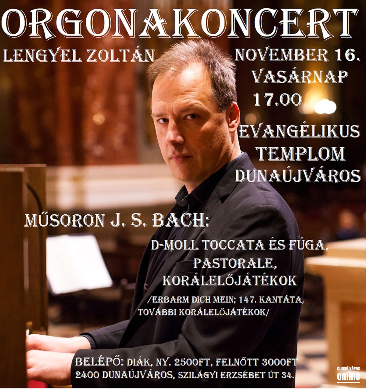 Már az ünnepi időszak jegyében szervezik a hangversenyt, amelyre vasárnap délután várják a zene szerelmeseit – Lengyel Zoltán orgonaművész Bach csodás remekműveit tolmácsolja a 17 órakor kezdődő koncerten. Flyer.
